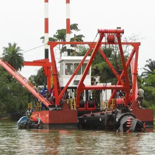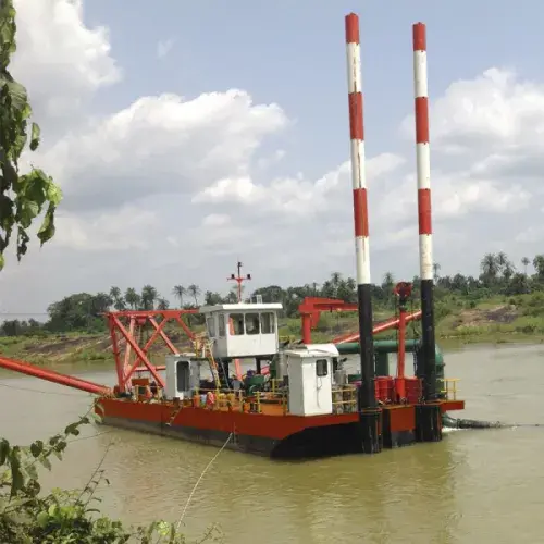 Die 2500-m³-Flussbaggerausrüstung unseres Unternehmens für die Sandabsaugung ist ein selbstfahrender oder nicht selbstfahrender, tragbarer Flussschneider-Saugbagger. Der Rumpf verfügt über eine zerlegbare und kastenartige Struktur. Der zerlegbare Typ kann leicht am Arbeitsplatz zusammengebaut und entsprechend auf der Straße, der Schiene und im Container transportiert werden, was die Installation und den Arbeitsplatzwechsel von einem zum anderen erleichtert. Das Stromversorgungssystem kann je nach Kundenwunsch als elektrisches System oder Dieselmotor-Antriebssystem ausgelegt werden. Die Ausrüstung des Saugbaggers für Flussreinigungsschneider besteht aus Faltenbälgen: Verfahrvorrichtung, Hebevorrichtung für Schneidleiter, Spuds und Deckkran.